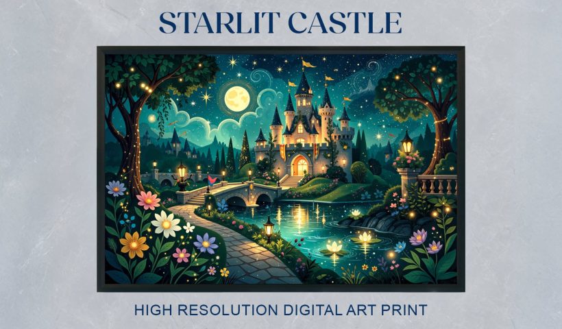 Bring a quiet fairytale atmosphere into your space with this magical ai-generated night illustration of a glowing castle beneath a sky full of stars. Warm lights shine from the towers and reflect softly in the…