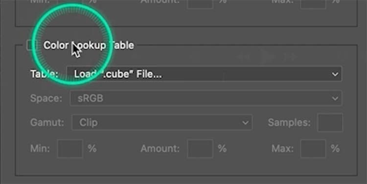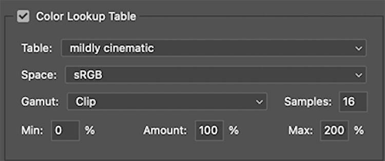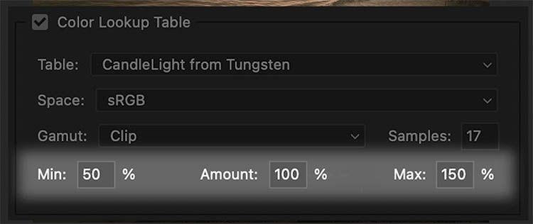 By default the Amount slider goes from 0 (Min) to 200 (Max). That means from nothing to double strength. The Amount is set to 100% which means the LUT will initially be applied as normal.