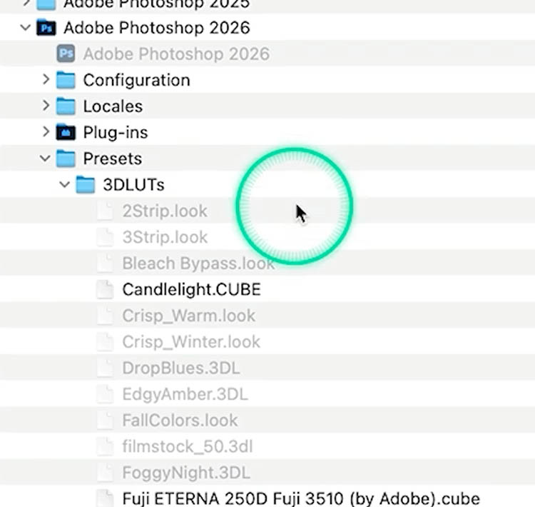 On Mac: Adobe Photoshop 2026/Presets/3DLUTs I think they are in a similar location on Windows. (drop a comment and let me know)
