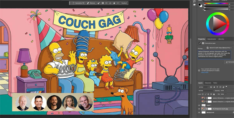Select All again and prompt: “Replace Simpsons characters with the people in the photograph; make them look like Simpsons characters but still themselves; remove original photo.”