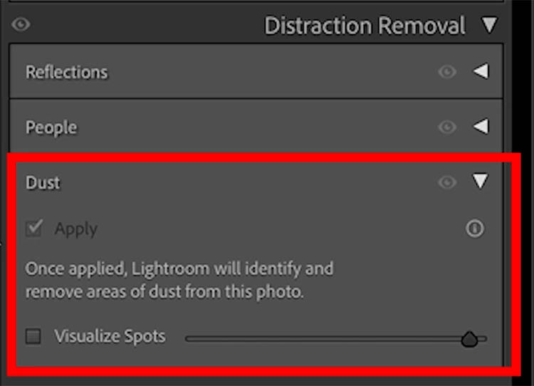 Auto ai Dust removal was recently added to Camera Raw, but now, it’s new in Lightroom.