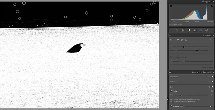 Lightroom automatically detects the spots and dust and applies the spot remove tool to them. You can see the small rings where the dust is removed.