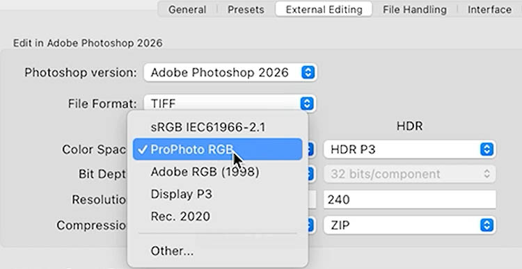 Previously, we could only works in Pro Foto RGB or Adobe RGB. Now other options like sRGB and Pisplay P3 have been added as options when opening an image in Photoshop for Lightroom Classic. There are now new options for HDR and Video.